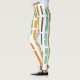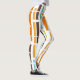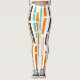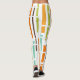 Estas leggings têm uma design de linhas verticais moderna do século médio nos anos 70, laranja, marrom, verde e azul, num campo de branco com linhas brancas horizontais cruzando-as.