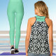 Estas leggings verdes de ioga de menta pastel podem ser comparadas com o tanque de nomes verde de menta geométrica nesta coleção.