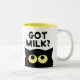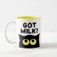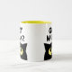 Gato Leite? Um presente de cãozinho engraçado para o dono do animal. Uma xícara branca e bonita, com desenho animado de gatinho e citação humorística. Ideia divertida de presente para amante de os animais, dono de gato, pessoa de gato, pai de gato, amante de estimação etc. Cor amarela ou personalizada no dentro. Silhueta de gato engraçada com olhos grandes amarelos.