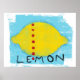 Um limão amarelo texturizado sobre um fundo azul do traneiro com pontos vermelhos e texto bagunçado com a palavra Lemon.