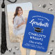 Adicione um toque legal personalizado a uma faculdade ou festa de formatura segundo grau com estes fãs de mão reais e brancos personalizados. Design apresenta uma imagem do formando, um boné de conselho de argamassa preta, tipografia na moda moderna, caligrafia de script manuscrita e uma mensagem personalizável lendo "Parabéns para nosso Formando". O texto na parte inferior inclui o ano da aula, o nome da escola e uma linha opcional para o grau, as honras ou a citação de inspiração favorita, obrigados, mãe e pai, ou outras informações. Todo texto é simples de personalizar. Faz uma ideia elegante e personalizada para favores e decorações de festas de formatura e é perfeita para exibir uma foto favorita, como uma imagem de mais velho ou imagem da cerimônia de início. Parabéns ao formando!