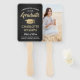 Adicione um toque legal personalizado a uma faculdade ou festa de formatura segundo grau com estes fãs personalizados de fotos preto, dourado e branco. Design apresenta um fundo preto esfregado em aço inoxidável, uma imagem do formando, tipografia moderna na moda, caligrafia de script de estilo manuscrito e uma mensagem personalizável lendo "Parabéns para nosso Formando". O texto na parte inferior inclui o ano da aula, o nome da escola e uma linha opcional para o grau, as honras ou a citação de inspiração favorita, obrigados, mãe e pai, ou outras informações. Todo texto é simples de personalizar. Observe que o ouro é impresso a cor, não a folha metálica. Faz uma ideia elegante e personalizada para favores e decorações de festas de formatura. Perfeito para exibir uma foto favorita, como uma foto de mais velho ou imagem da cerimônia de inicio. Parabéns ao formando!