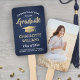 Adicione um toque personalizado legal a uma faculdade ou festa de formatura de segundo grau com estes ventiladores de fotos personalizados azul, dourado e branco. Design apresenta um fundo azul esfregado em aço inoxidável, uma imagem do formando, tipografia moderna na moda, caligrafia de script de estilo manuscrito e uma mensagem personalizável lendo "Parabéns para nosso Formando". O texto na parte inferior inclui o ano da aula, o nome da escola e uma linha opcional para o grau, as honras ou a citação de inspiração favorita, obrigados, mãe e pai, ou outras informações. Todo texto é simples de personalizar. Observe que o ouro é impresso a cor, não a folha metálica. Faz uma ideia elegante e personalizada para favores e decorações de festas de formatura. Perfeito para exibir uma foto favorita, como uma foto de mais velho ou imagem da cerimônia de inicio. Parabéns ao formando!