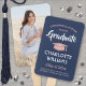 Adicione um toque legal personalizado a uma faculdade ou festa de formatura segundo grau para ela com estes fãs de mão de ouro, cor-de-rosa, azul, branco e rosa, personalizados. Design apresenta uma imagem do formando, da tipografia moderna na moda, da caligrafia de scripts de estilo manuscrito e uma mensagem personalizável lendo "Parabéns para nosso Formando". O texto na parte inferior inclui o ano da aula, o nome da escola e uma linha opcional para o grau, as honras ou a citação de inspiração favorita, obrigados, mãe e pai, ou outras informações. Todo texto é simples de personalizar. Observe que o ouro rosa é impresso a cores, não em folhas metálicas. Faz uma ideia elegante e tradicional personalizada para favores e decorações de festa de formatura. Perfeito para exibir uma foto favorita, como uma foto de mais velho ou imagem da cerimônia de inicio. Parabéns ao formando!