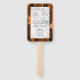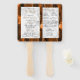 This elegant, modern wedding program fan features a burnt orange agate background trimmed with gold faux glitter. The text appears in elegant gold-colored handwriting and black copperplate fonts on a gray and white marble rectangle.