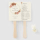 Programa de fãs de mão com uma coroa de estilo moderno com rosas de aquarela em um tema de cor de champanhe, chocolate marrom e rosa-pincel. Ouro escondido, coroa e folhagem dourada. Por favor, note: os detalhes gravados em ouro são uma imitação, não uma folha de ouro.