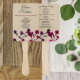 Esta design de papelaria de casamento é sofisticada e elegante, com um fundo bege quente e neutro. A parte inferior do design é enfeitada com uma bela ilustração de flores vibrantes em tons de roxo profundo, rosa e vermelho, dispostos em um padrão natural e fluente. O trabalho de arte floral adiciona um talento caprichoso e artístico, complementando a estética geral e equilibrando a parte superior com texto pesado. A combinação da paleta de cor quente, tipografia elegante e embelezamento floral cria um design harmonioso e convidativo, perfeito para exibir o programa de casamento.