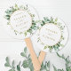 Este leque de mão para casamento apresenta folhagem de eucalipto pintada em aquarela, folhas verdes com uma moldura circular dourada. Para personalização avançada deste design, clique no link "Personalizar ainda mais". Itens correspondentes também estão disponíveis.
