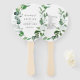 Estes elegantes fãs românticos do programa de casamento botânico floral apresentam uma coroa de água pintada manualmente de verde e flores brancas de magnólia. Personalize com os nomes da noiva e noiva e a data do casamento na frente e os detalhes da sua cerimônia nas costas. Desenhada por Susan Coffey.