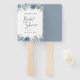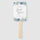 Ventiladores de mão elegantes que apresentam flores botânicas de cor aquosa e folhagem em tons de azul com letra de "Chá de panela" caligráfica e respaldo a cor azul empoeirado sólido.