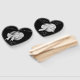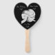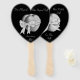 Este design de ventilador original tem um toque cínico divertido nele, mas você pode personalizá-lo da maneira que quiser. Os dois corações das cinzas estão ligados com um arco branco de fita, a imagem do amor é colocada contra um fundo preto, a mesma imagem está na parte traseira do ventilador. É uma design de casamento básica que será apreciada por casais que não querem ir "acima do topo" pelo seu grande dia, mas que ainda querem dar aos seus convidados algo para guardar como lembrança de casamento. Um fã é algo útil que pode conter todas as informações importantes do casamento e mantê-lo legal ao mesmo tempo!
