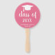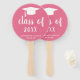 Ventiladores de mão de graduação minimalista apresentando um design simples e clássico com um boné formando e uma "classe de ano" em uma escrita grossa juntamente com o nome do formando em branco sobre um fundo rosa. A cor de fundo pode ser alterada para qualquer cor que você desejar. Um estilo tradicional com um talento moderno para um formando feminino.