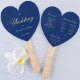 Um simples mas elegante leque de programa de casamento em forma de coração para um tema de casamento azul real e dourado. Os títulos e os nomes (e as iniciais) da noiva e do noivo são escritos em uma elegante caligrafia, o restante em letras maiúsculas. O fundo é azul real, o texto é amarelo dourado. No verso, tem no lado esquerdo o programa da cerimônia de casamento e, no lado direito, os membros da festa (com 2 colunas diferentes para a equipe da noiva e a equipe do noivo) e abaixo deles uma curta mensagem de agradecimento.