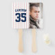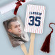 Mantenha-se legal e mostre seu apoio ao jogador de beisebol em um jogo, graduação ou qualquer evento com este fã de mão fotográfica apresentando um padrão de listras de camisa de beisebol na frente com cores que sejam totalmente personalizáveis (Para mudar a cor das listras, clique em personalizar, selecione a camada "ThinStripes1" e altere a cor de preenchimento. Para alterar a cor de fundo, selecione-a para alterar). No verso você pode adicionar sua foto. Personalize este ventilador substituindo o texto do marcador de posição e substitua a foto do marcador de amostra/marcador de posição pela sua própria foto. Para obter mais opções, como alterar a fonte e seu tamanho/cor, o espaçamento entre letras ou expandir ou contrair texto curvo, clique no botão "Personalizar". *Observe que a Marca d'água do Zazzle que aparece na visualização de zoom NÃO aparecerá no produto impresso final. © Rosewood e Citrus