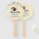 Um fã de mão de bash personalizado com um tema de sorvete. Confete colorido ao longo do topo. Ilustrado com um bar de sorvete de chocolate, sundae de 3 colheres com uma cereja no topo, e um float de morango com chantilly. Pequenos morangos e cerejas. Fundo amarelo pálido. Refrescante, guloseimas de verão.
