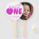 Para o primeiro aniversário de uma garota com o tema Doce Um / rosquinhas / doces. As letras em UM estão cobertas de glacé cor-de-rosa com aspersão colorida. O O é uma rosquinha rosa. Acima disso, a palavra "doce" está escrita em um guião rosa de escrita manual. Sob tudo isso, a ocasião é escrita no mesmo roteiro, mas pequena e rosa, com a data em bonés cor-de-rosa embaixo dela. No verso, há uma foto marcante de uma garotinha com rabos.