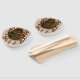 Um design de caçador de sonhos com guarnições douradas e marrons que inclui uma teia redonda de vida em círculo de bambu com penas castanhas e miçangas vermelhas em um fundo de pena macia para um casamento.