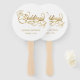 A formal, elegant white wedding hand fan with faux gold calligraphy script.