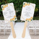Ventilador do programa de casamento com recursos de design de um padrão geométrico elegante de brilho dourado brilhante. Sobreposta com rosas de cor laranja e folhagem verde em dois cantos. Personalize esta modelo para adicionar suas informações na parte frontal e traseira da placa. Clique para personalizar ainda mais para fazer mais alterações. Tudo é personalizável. Precisa de personalização ou de perguntas e, em seguida, entre em contato com o designer Sandy em admin@giftsyoutreasure.com