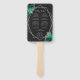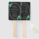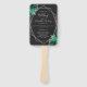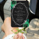 Este elegante fã do programa de casamento apresenta uma estrutura geométrica prateada decorada com buquês florais esmeraldas e prateados. O texto aparece em letras elegantes de cinza prateada e fontes copperplate em um fundo fora de preto.
