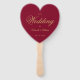 Um fã do programa de casamento em forma de coração simples mas elegante para um tema de casamento de burgundy e ouro. Os títulos e os nomes (e as iniciais) da noiva e do noivo são escritos em uma escrita elegante, o restante em bonés. O fundo é vermelho borrado, o texto é amarelo ouro. No verso, tem no lado esquerdo o programa da cerimônia de casamento e, no lado direito, a festa de casamento (com 2 colunas diferentes para a equipe da noiva e do noivo). e sob eles uma pequena mensagem de agradecimento.