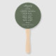 Linda coloração aquática, folhagem botânica e coroa floral de jardim, fãs de mão do programa de casamento. A parte traseira apresenta fundo verde de cor sólida e linhas de texto para uma lista detalhada da festa de casamento.