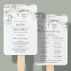 Programa personalizável de fãs de casamento, com flores brancas delicadas em um fundo branco limpo.