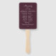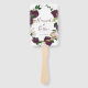 Linda coroa floral, fãs de mão de casamento. Flores roxas e brancas de marfim de ameixa elegantes com verde rico e verde-folha-ouro. A parte traseira apresenta fundo de cor roxa de ameixa sólida e linhas de texto branco para uma lista detalhada da festa de casamento.