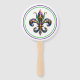 This paddle fan is shown in a festive Mardi Gras Fleur de Lis print.