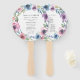 Elegante leque de mão para programa de casamento floral com os seus nomes circundados por uma coroa de flores em tons de roxo, lilás e azul com folhas verdes. Personalize os leques do programa de casamento adicionando a data e local do casamento, ordem dos eventos e membros da festa de casamento no verso. Projetado para combinar com a nossa coleção de casamento Midnight Blooms.