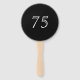 Personalize esses ventiladores manuais com qualquer texto na frente e atrás. O exemplo foi dado para "feliz aniversário" e "75 anos".