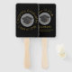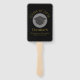 Um fã de mão de graduação. Na frente, ela diz Parabéns Formandos, Classe 20xx e atrás o nome do formando, a escola e a classe 20xx, escritos em uma cor dourada. Projetado com um boné de formatura preto cercado por um círculo branco semitransparente. O fundo preto com letras douradas é simples, mas na moda.