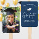 Ventilador de mão de fotografia de graduação moderna com letras brancas em negrito com fundo de Marinho. O design apresenta um boné de formatura branco com a frase "Parabéns ao nosso Formando". Personalize o sinal de graduação laranja adicionando o nome do formando, o nome da escola e o ano de graduação. Para uma aparência mais personalizada, mude o fundo para as cores da sua escola. O poster de graduação é perfeito para usar para a sua festa de segundo grau ou formandos!