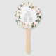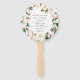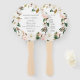Fã de mão do programa de casamento floral elegante com seus nomes cercados por coroa de magnólias brancas, rosas cor-de-rosa pinceladas, flores de algodão e folhas verdes. Personalize os fãs do programa de casamento floral adicionando sua data e local do casamento, ordem dos eventos e festa de casamento no verso. Projetado para coordenar com nossa coleção de casamento Watercolor Magnolias.