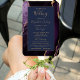 Este elegante e moderno fã do programa de casamento mostra um fundo agado roxo, aparado com brilho dourado. O texto aparece em letras elegantes douradas e fontes em cores em um retângulo azul marinho.