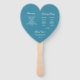 Um leque de programa de casamento em forma de coração. Na frente, o fundo é uma geoda azul com muitas nuances de azul, o verso é apenas azul. Os títulos e os nomes (e as iniciais) da noiva e do noivo são escritos em uma fonte caligráfica elegante, o restante em letras maiúsculas. O texto é branco. No verso, está à esquerda o programa da cerimônia de casamento e, à direita, os membros da festa (com 2 colunas diferentes para a equipe da noiva e a equipe do noivo). e abaixo deles uma curta mensagem de agradecimento.