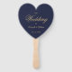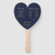 Um fã do programa de casamento em forma de coração simples mas elegante para um tema de marinho e casamento de ouro. Os títulos e os nomes (e as iniciais) da noiva e do noivo são escritos em uma escrita elegante, o restante em bonés. O fundo é marinho azul, o texto é ouro amarelo. No verso, tem no lado esquerdo o programa da cerimônia de casamento e, no lado direito, a festa de casamento (com 2 colunas diferentes para a equipe da noiva e do noivo). e sob eles uma pequena mensagem de agradecimento.