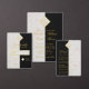 Um design moderno - meio negro e meio branco mármore, com texto ouro. Na frente, acima do texto, há um monograma em um quadrado de mármore branco com bordas falsas de ouro. No verso, ele tem do lado esquerdo (branco) o programa da cerimônia de casamento e, do lado direito (preto), a festa de casamento (com 2 colunas diferentes para a equipe da noiva e do noivo). e sob eles uma pequena mensagem de agradecimento.