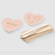 Um simples mas elegante leque de programa de casamento em forma de coração para um tema de casamento rosa e dourado. Os títulos e os nomes (e as iniciais) da noiva e do noivo são escritos em uma elegante caligrafia, o restante em letras maiúsculas. O fundo é rosa (rosa claro), o texto é amarelo dourado. No verso, tem no lado esquerdo o programa da cerimônia de casamento e, no lado direito, os membros da festa de casamento (com 2 colunas diferentes para a equipe da noiva e a equipe do noivo) e abaixo deles uma curta mensagem de agradecimento.