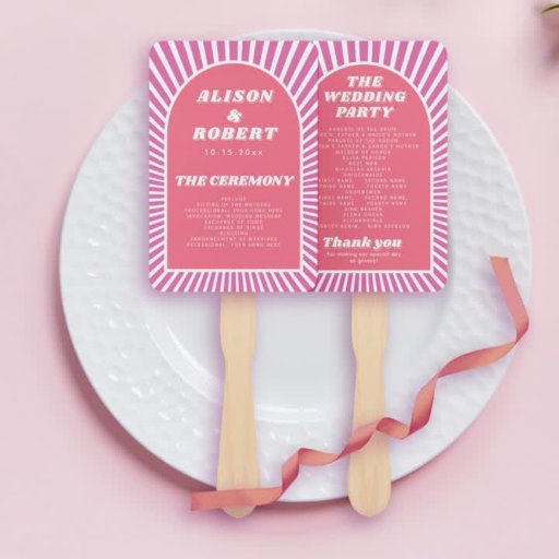 Este sofisticado fã de mão do programa de casamento é a forma perfeita de transmitir os detalhes do seu dia especial de estilo. Ele foi projetado com uma estrutura de arco que você pode personalizar com o texto de sua escolha e atrás dele está um design brilhante e atraente de raios de sol rosas e brancos, que lhe dá uma vibração retrô inconfundível dos anos 70. Este fã de mão do programa de casamento é a solução ideal para manter seus convidados legal enquanto adiciona um toque de talento ao seu grande dia. O cobrir foi projetado usando alguns recursos de Freepik.com