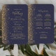 Este elegante e moderno fã do programa de casamento mostra um fundo azul escuro coberto de cintilação dourada. O texto aparece em letras elegantes douradas e fontes em cores.