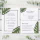 Um fã de mão do programa de casamento moderno, apresentando um simples design com duas folhas de palma verdes grandes junto com seus eventos de cerimônia, sobre um fundo branco no lado frontal. A parte de trás tem uma folha de palma e sua festa de casamento. Este design tropical é perfeito para um casamento de verão na praia.