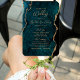 Este elegante e moderno fã do programa de casamento apresenta um fundo azul-lacrimejado, coberto de brilho dourado. O texto é exibido em letras maiúsculas e minúsculas.