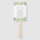 Leques de mão para programa de casamento botânico com uma borda superior e inferior composta por suculentas em aquarela verde na frente e uma borda superior no verso. Os seus detalhes estão em uma fonte cinza suave. Adicione os eventos da cerimônia na frente e os membros da festa de casamento e uma mensagem de agradecimento opcional no verso. Estes leques de mão ajudarão a manter seus convidados frescos durante um casamento ao ar livre e fornecerão a eles a ordem do serviço. Eles também são uma ótima lembrança e são perfeitos para um casamento no deserto na primavera ou verão.