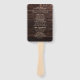 Programa de cerimônia de casamento/ordem de serviço em leques manuais em madeira escura rústica marrom com texto cor creme. Estes leques incluem o programa da cerimônia juntamente com os nomes dos pais da noiva e do noivo, o celebrante, a corte de honra e outros participantes. Contacte-nos para obter ajuda com personalização ou produtos correspondentes.