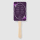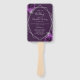 Este elegante fã do programa de casamento apresenta uma estrutura geométrica prateada decorada com buquês florais roxos e prateados. O texto aparece em letras elegantes de cinza prateada e fontes em prata sobre fundo roxo.