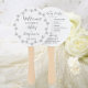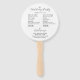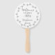 Programa de quarta-feira em um fã de mão estilo redondo que apresenta uma design de cor clara de mariada de cinza clara sobre fundo branco, com os nomes de noiva e noivo e data na frente do fã, juntamente com cinzas escuras, um roteiro estilizado que lista os participantes da festa de casamento e os ritos de cerimônia na parte de trás do fã. Personalize seu ventilador manual editando e substituindo nomes e informações por suas próprias informações do programa de casamento. Perfeito para um verão, local de casamento ao ar livre! Selecione o número de ventiladores manuais desejados.