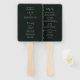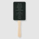 Um simples conjunto verde-escuro de fãs do programa de casamento pode ser personalizado com os nomes da noiva e do noivo, assim como informações sobre a cerimônia e a festa de casamento.