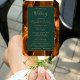 Este elegante e moderno fã do programa de núpcias mostra um fundo laranja queimado, aparado com brilho dourado. O texto aparece em letras elegantes douradas e fontes em cores em um retângulo verde escuro.