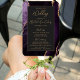 Este elegante e moderno fã do programa de casamento mostra um fundo agado roxo, aparado com brilho dourado. O texto aparece no moderno script de escrita manuscrita dourada e na letra da placa em um retângulo fora de preto.